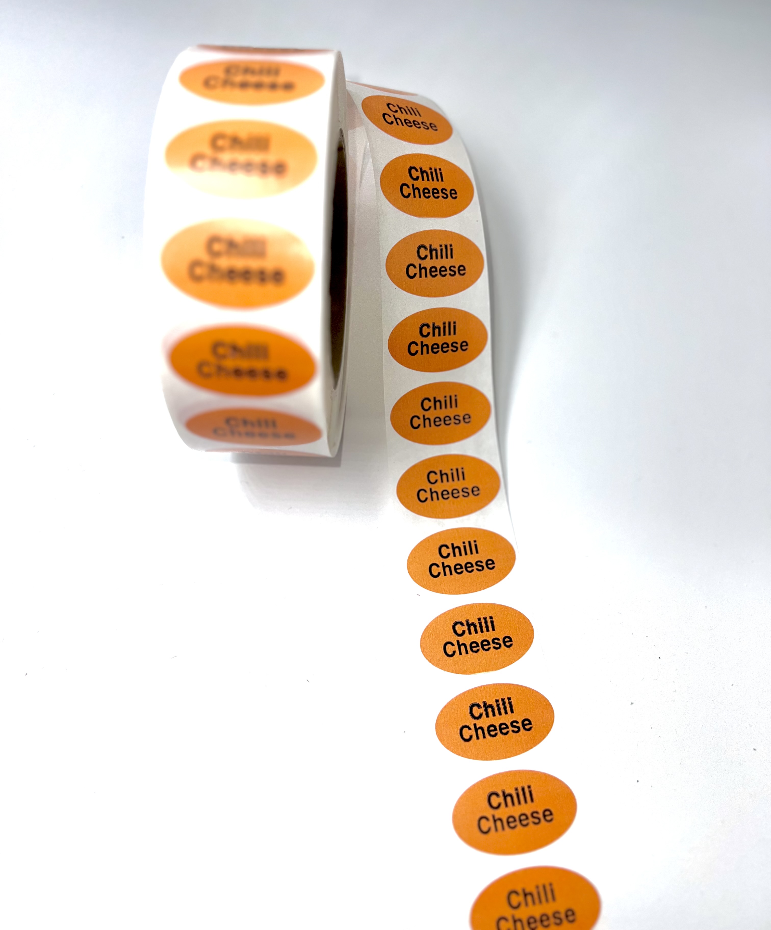 1.5" Chili Cheese promotional label in brown. 2000 labels per roll, 3 rolls per case.