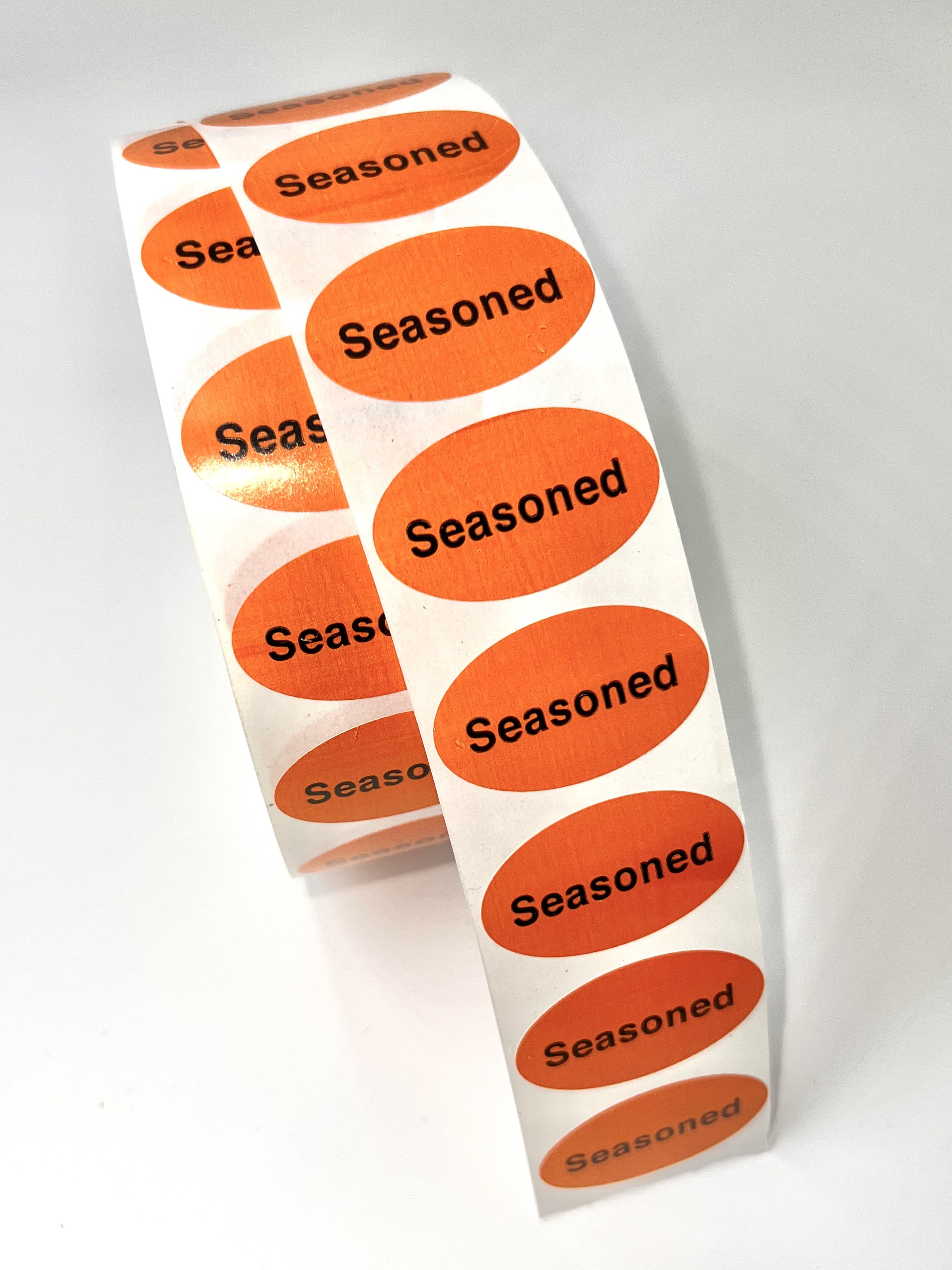 1.5" Seasoned promotional label in brown. 2000 labels per roll, 3 rolls per case.